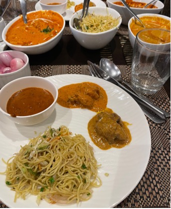 こちらがムンバイでの食事です。焼きそばのようなものはチョウミンと呼ばれます。この時のカレーは皆さんがイメージするような、いわゆるインドカレーでした。こちらもかなりスパイシーでしたが美味しかったです。しかし、少し油が多く、刺すような日差しの中を歩き回った後だったためか、日本のカレーより重たく感じました。