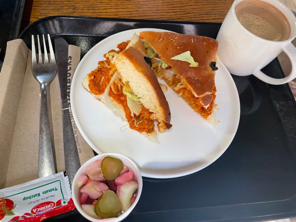 旅の途中で、インド料理ではないものが食べたくなり、インドのスターバックスでサンドイッチを注文しました。しかし、こちらのサンドイッチもかなりスパイシーでした。